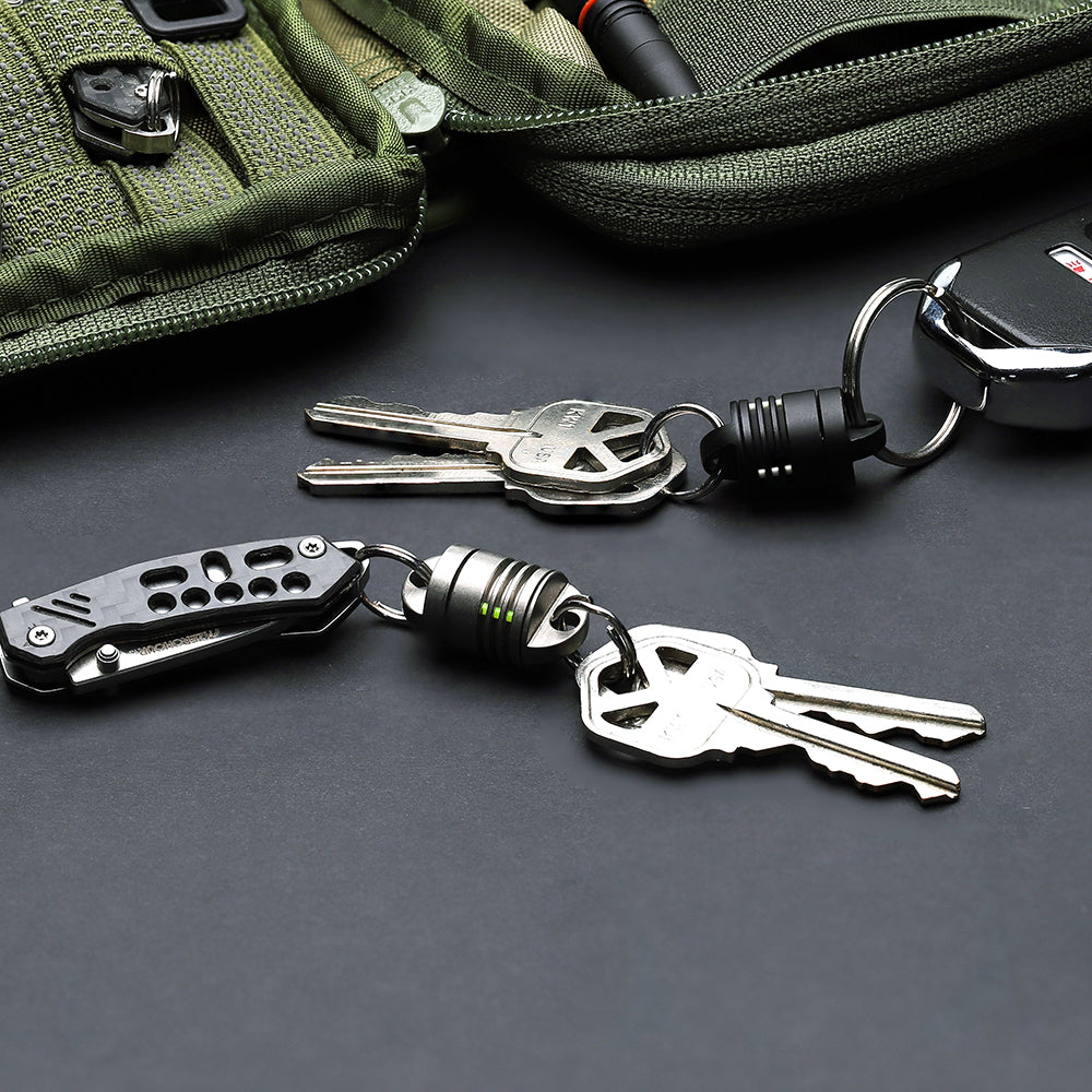 Designed to go beyond a simple keychain holder this quick release system uses smarter construction and two ultra-strong magnet to let you attach your keys, a pocket knife, small flashlight, or other keychain gear, so you can grab them off a belt loop, bag, or your EDC organizer, and put them back in a flash.